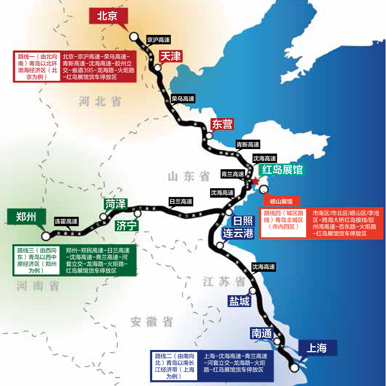 (北京為例,由北向南,青島以北環(huán)渤海經(jīng)濟(jì)區(qū)):北京-京滬高速-榮烏高速-青新高速-沈海高速-膠州立交-省道 395-龍海路-火炬路-紅島館貨車停放區(qū)